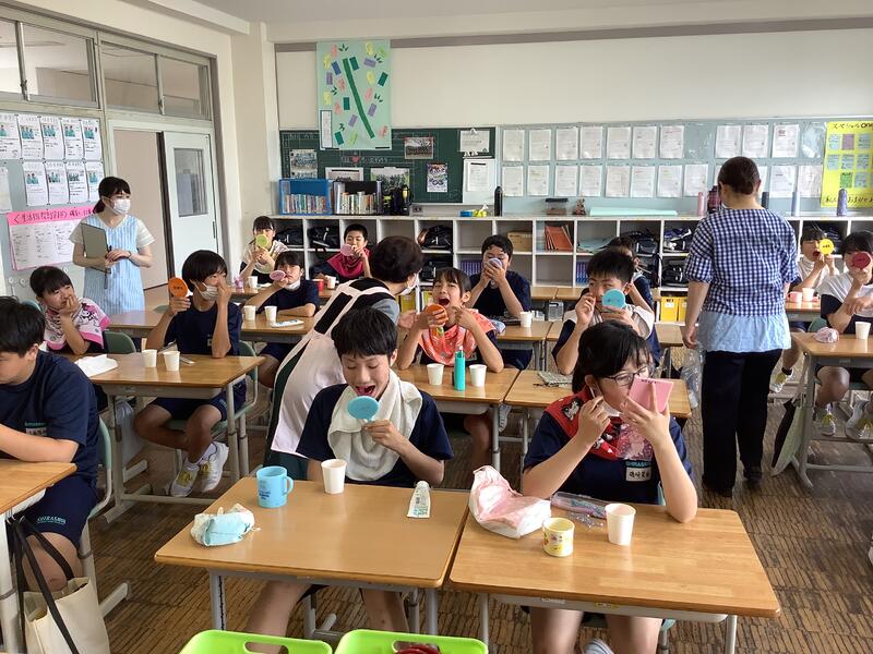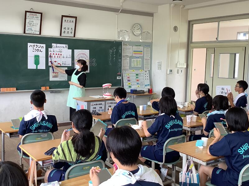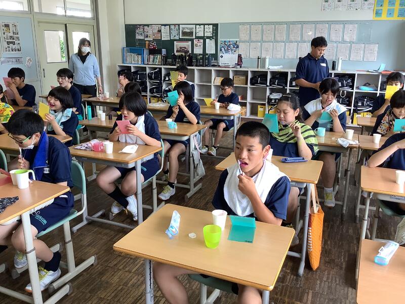 5時限目は、1年生の歯磨き教室です。歯科衛生士の伊藤享子様、竹内由美様に来校していただき、歯磨きの仕方、大切さについて教えていただきました。染め出しを行い、自分が思っているよりも磨き残しが多いことや鏡を見ながら丁寧に磨くことの大切さを知ることができたようです。リステリンの使い方について質問もあり、自分の歯についてしっかりと向き合って学習していました。