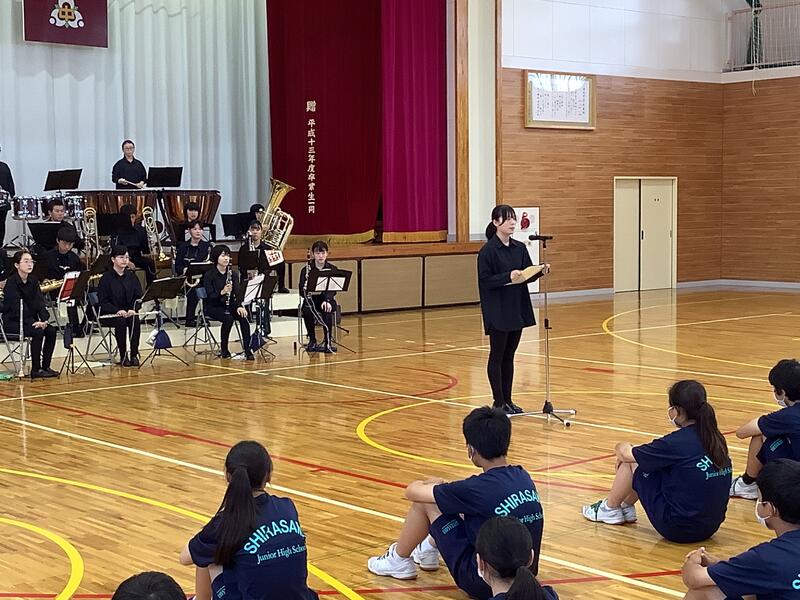 代表あいさつは、吉村知結美さんか行いました。「曲は、【漆黒のルピナス】です。ルピナスを音楽室に飾り、花言葉の《想像力》《常に前向き》という意味のとおり、気持ちを込めて演奏し、東北大会に出場したいです。」と力強く話していました。