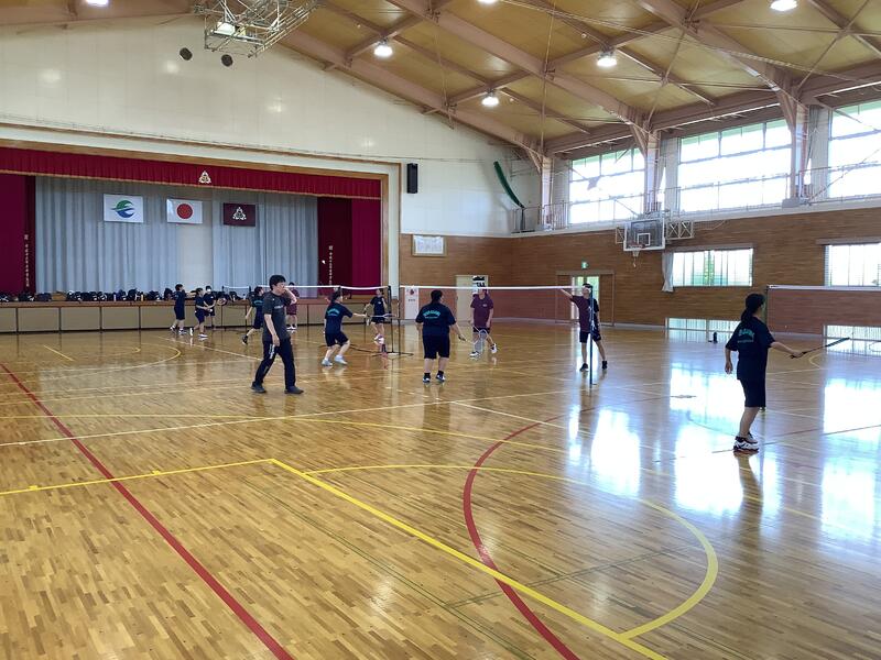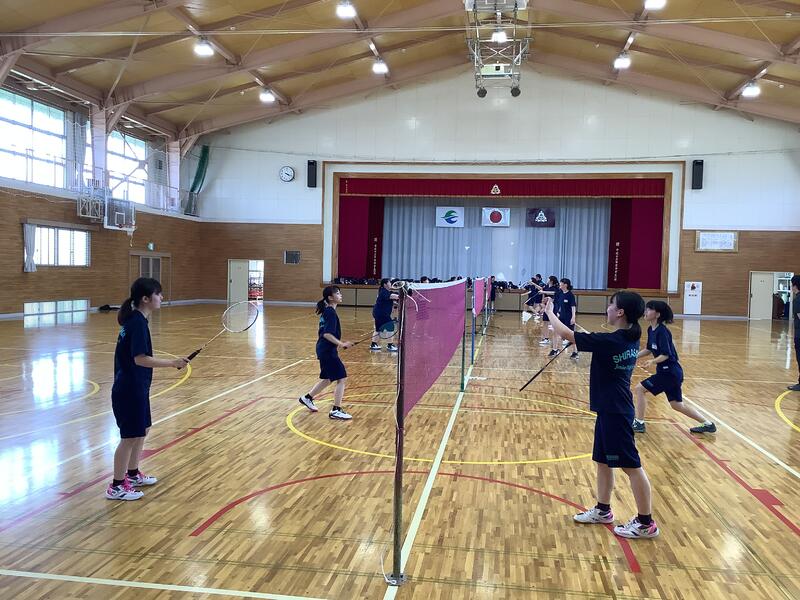 バドミントン部。ネットを一面に張り、時間を決めて、徹底してネット際のシャトル捌きの練習やフットワークの練習でした。菅野教諭がポイントを絞って短い言葉でわかりやすく指導していました。リーダーの指示でメリハリのある活動をしていました。