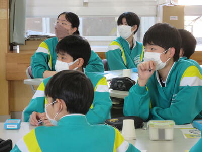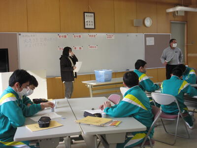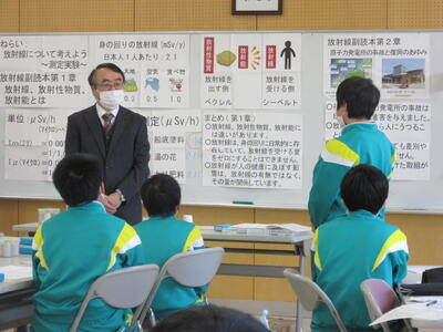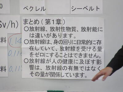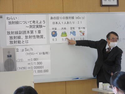 コミュタン福島より教育アドバイザーの佐々木様を講師としてお招きして1年生を対象とした放射線教育をおこないました。放射線に関するクイズや放射能測定器、数多くの視覚資料を使用しながらテンポよく進めていく佐々木様の講義に1年生の生徒は夢中になっている様子でした。