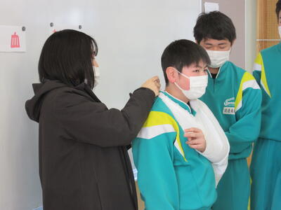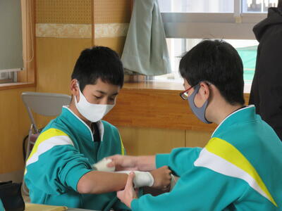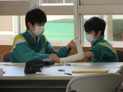 2年生保健体育の授業で応急手当と包帯法について学習しました。すり傷やさし傷、やけど等の際の応急手当の仕方について養護の先生から説明を受けた後、生徒同士で包帯の巻き方の実習を行いました。授業最後には三角巾の使用法についても触れ、生徒は応急手当の知識や技能を深めることができました。