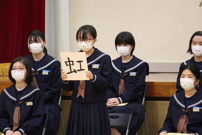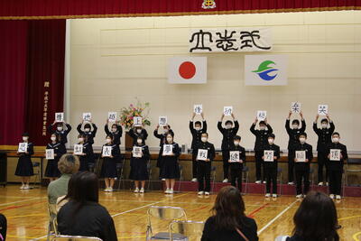 昨日、立志式が行われました。生徒たちは、将来の自分の姿を想像して、どんな人になりたいかを漢字一文字で表現し、その漢字を選んだ理由を発表しました。その他に、お二人からのお祝いメッセージや市コミュニティースクール推進協議会長の國分進様から、言葉のもつ重さと自分の言葉で表現することの大切さについて講話をいただきました。2年生たちは、どんな大人に成長していくのでしょうか。将来が楽しみです。