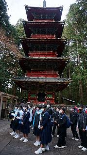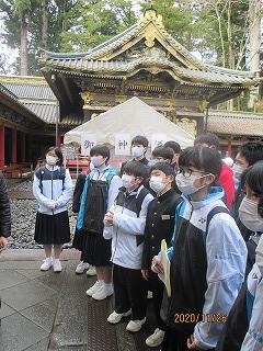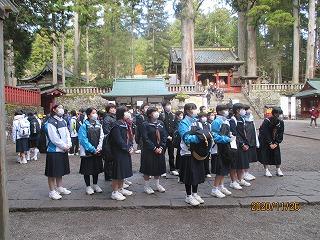 1年生は、日光東照宮と日光彫体験を実施しました。感染症拡大対策のため、マスク着用やアルコール消毒の徹底を図り、バスの中でも席を離しての移動など、いつもとは異なるものでしたが、みんなで一緒に、みんなと同じく行動する楽しさを十分に味わうことができた見学旅行となったようです。心配された天気ももち、晩秋の日光を満喫することができました。