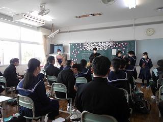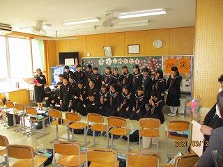退場後は、1年生が教室の机を片付けていてくれ、少し広くなった教室で最後の学級活動を。3クラスとも卒業生からクラスメイトに一言ずつ話をし、最後に担任から最後の言葉があったようです。