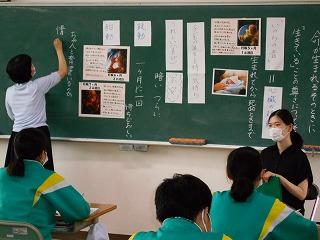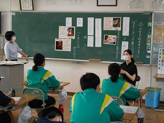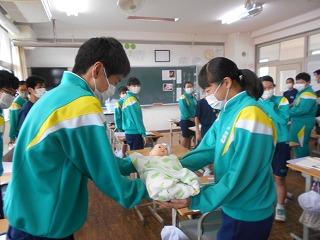 「生きていると感じるときは?」という事前のアンケートを基に、命について考える機会としました。等身大の新生児人形を各自でだっこしたり、まもなく産休に入る養護教諭から「母になる思い」を聞いたりしながら授業を進めました。生徒たちは真剣に考え、いろいろと感じることができたようです。
