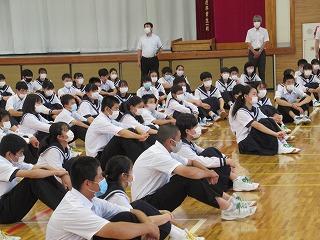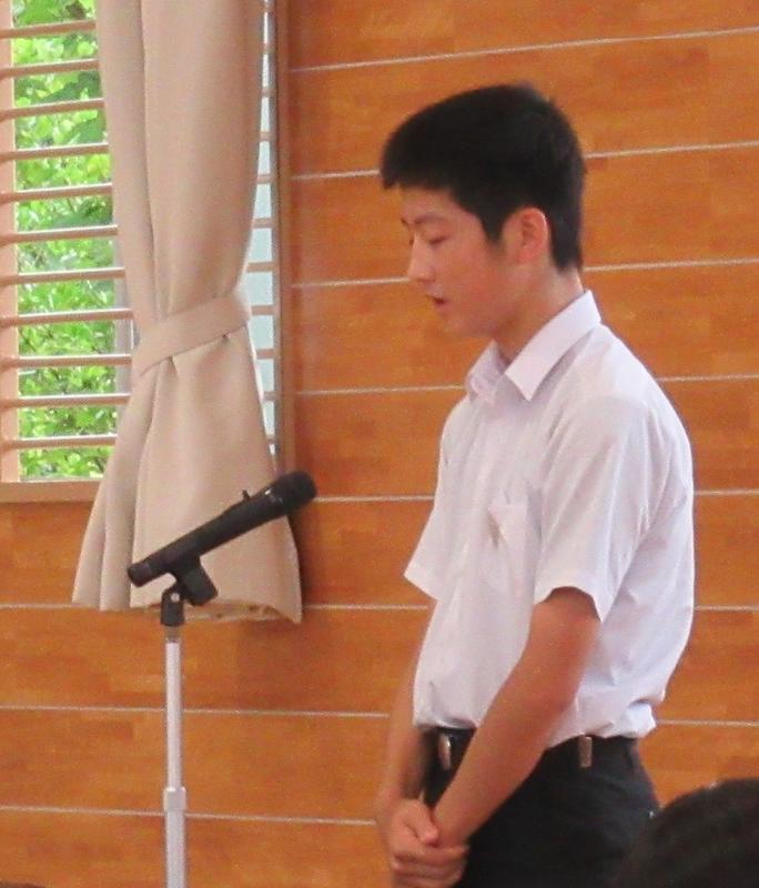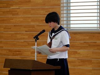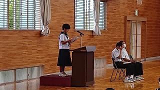 本日の始業式では、校長の式辞のあと、各学年の代表者から「夏休みの反省と2学期の抱負」が述べました。3名の代表者(1年湯田さん、2年大森さん、3年吉村さん)は、堂々と発表し、全校生とも自分に当てはめながらしっかりと聞き、考える機会となりました。