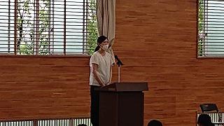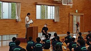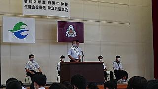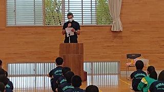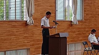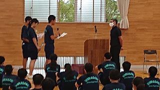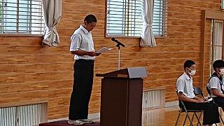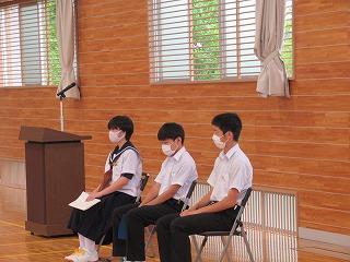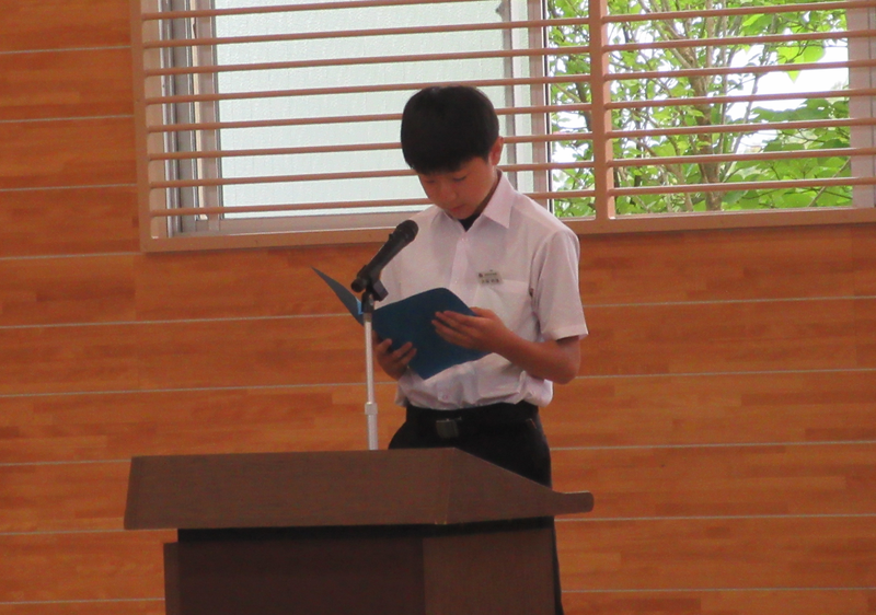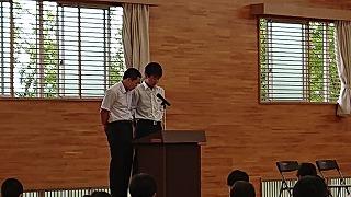 終業式では、本宮市のソフトテニス大会や安達地区部活動交流大会の表彰披露のあと、校に長先生からこの1学期を振り返りながら、夏休みや2学期にむけてやるべきこと、頑張ってほしいことなどの話がありました。生徒代表の発表では、1学期の反省と夏休みに向けて各学年の代表(1年 吉村(ひ)さん、2年 市川(晟)さん、3年 菅野(倭)さん)から発表がありました。