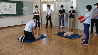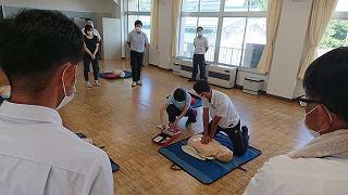 2学期のスタートにあたり、教職員の研修として、心肺蘇生法の講習を行いました。新型コロナウィルスの感染拡大防止のため、消防署員の方を講師に招くことはできませんでした。しかし、本校には元消防士の教員がいるため、消防署から訓練用のセットを借り、校内で実施しました。