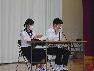新型コロナウィルス感染拡大による休校等により、実施できていなかった生徒総会を、本日感染防止対策をしながら実施しました。生徒会本部役員や専門委員長、各部の部長など3年生を中心に、準備や運営を行いました。
