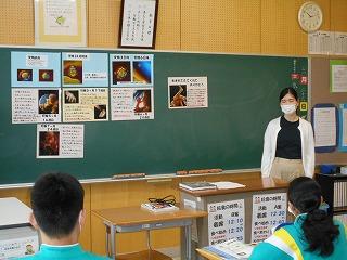 3年生の理科の授業に、ゲストティーチャーとして養護教諭の吉田先生が参加し、授業を行いました。内容は、生命の誕生。「動物の生殖」を学んだあとで「では人間は?」ということで、吉田先生からお話をいただきました。吉田先生は現在妊娠7ヶ月。ご自分のお話を交えつつ、命の誕生について、生徒に分かりやすく、且つその大切さについてお話がありました。生徒は真剣に話を聞いており、充実した授業となったようです。