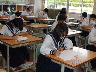 新型コロナウィルスの感染拡大防止のため、中間テストは中止となり、予定より時期を遅らせて本日期末テストを実施しました。1年生にとっては初めての、2・3年生にとっては久しぶりのテストということで、計画的に学習に取り組んでいたようです。明日から順次採点されたテストが戻ってくるかと思いますが、結果に一喜一憂せず、次の学習の糧にしてほしいと思います。また、14日には2・3年生は実力テストが行われます。前の学年の総復習になりますので、しっかり準備をして、テストに臨んでほしいと思います。