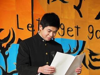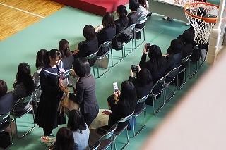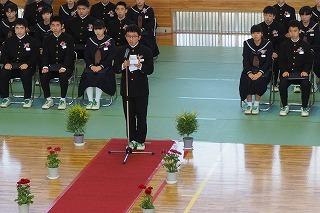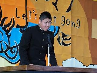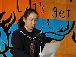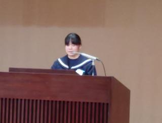 その後、生徒発表では、1年の山際さんと2年の三瓶(楓)さんから今年度の反省と来年度に向けての抱負が発表されました。二人とも堂々と自分の考えをのべ、この一年間で成長した姿が見られました。