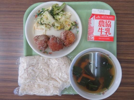 ソフトめん みそつくねかけ汁 ブロッコリーサラダ 手作りおからドーナツ 牛乳