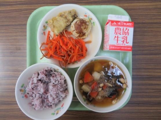 紫黒ごはん こづゆ にしんとまんじゅうの天ぷら いかにんじん 牛乳