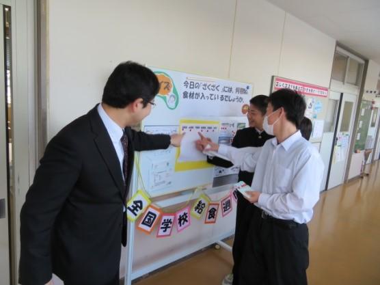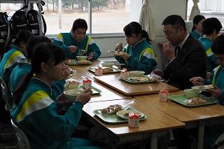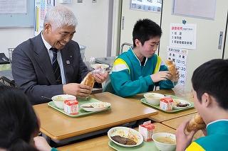 また、本宮市教育委員会の青田教育長さんと後藤教育部長さんが、1年1組で一緒に給食を食べました。また、ALTのシェン先生も母国の給食を一緒に食べました。英国との交流は夏に、3年生が4名(市内で12名)が訪問してきました。今後も継続して交流を図っていきたいと考えています。