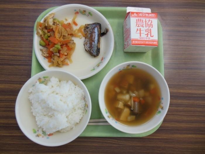 本日の給食は <中通り地方の郷土料理>で、 ごはん ざくざく さんまのみそ煮 引き菜炒り 牛乳でした。