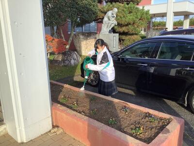 あいさつ運動の横では、花の水やりをしていました。寒い中、蛇口をひねってホースでの水やり、重たいジョウロを運んでの水やり、大変でしたが楽しそうに活動していました。