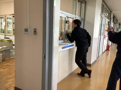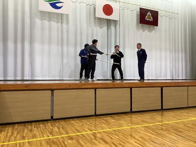 本日の避難訓練は、学校に不審者が入ってきた場合を想定としたものでした。学校の敷地は塀やフェンスで囲まれているわけでないので、どこからでも入れる状況にあるといえます。また、「不審者は来ないだろう」という油断は、いざというときに適切な行動が取れなくなるかも知れません。生徒だけでなく、私たち教職員の訓練として位置付けられた訓練です。警察の方に不審者役をしていただき、迫力ある演技をしていただいたおかげで、緊張感をもって不審者対応の訓練ができました。なお、避難後は簡単な護身術を学びましたが、もっとも大切なのは不審者を刺激せずに距離を取ることだそうです。