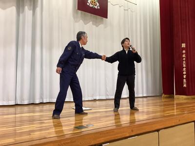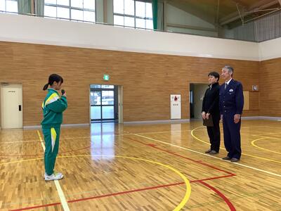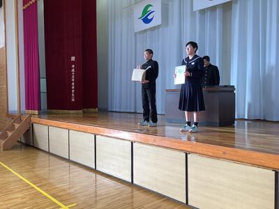 続いては、KKKコンテストの表彰です。環境委員長から3年2組に賞状と、清掃グッズの記念品が授与されました。なお、3年2組は2回連続の受賞です。どのクラスも次こそは!という気持ちです。