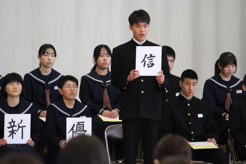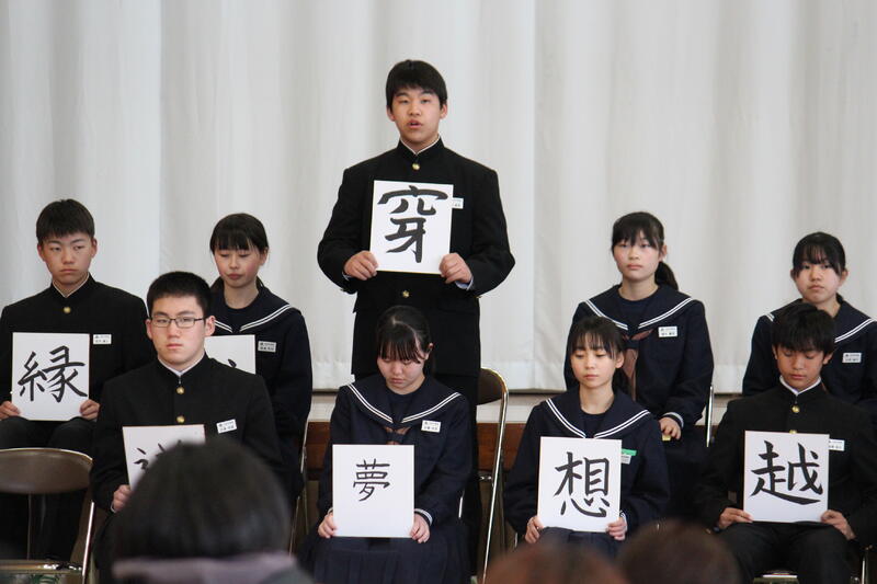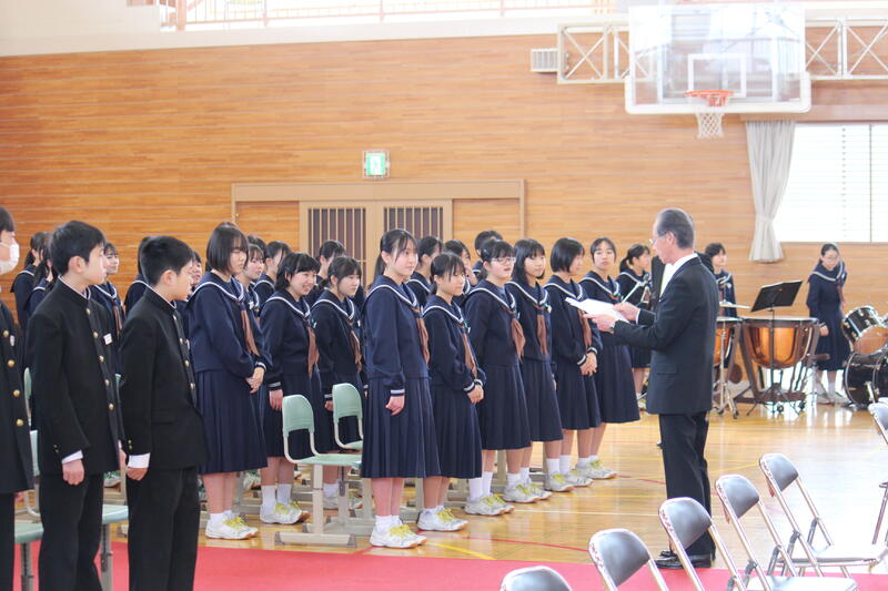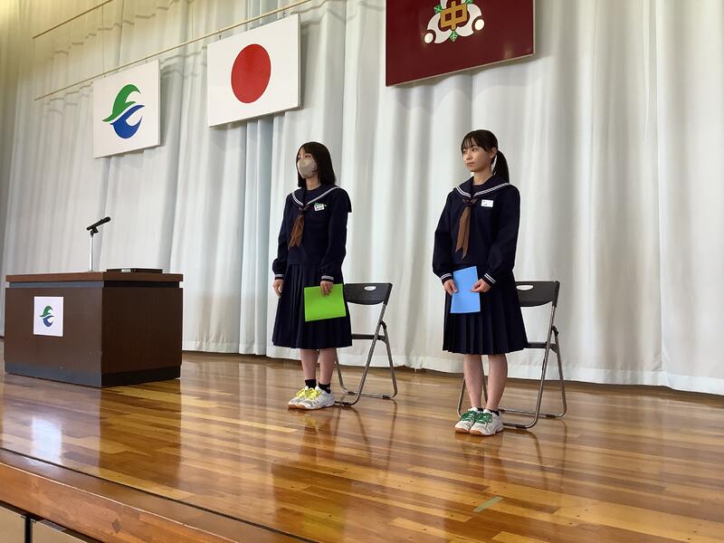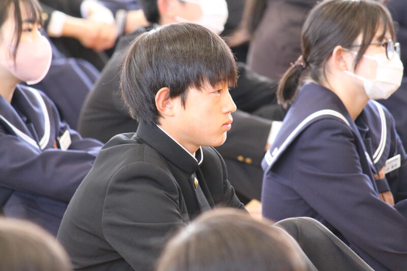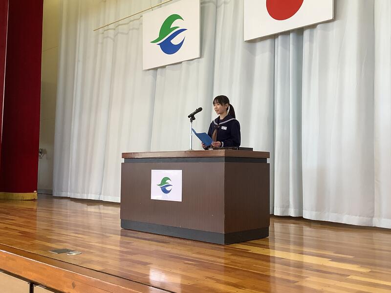 生徒作文発表では、1年稲田さん、2年遠藤さんが、1年間を振り返っての発表をしました。丁寧に言葉を選んで、全校生に伝えるように発表しました。前向きな表現が多く、生徒たちもしっかりと聴いていました。