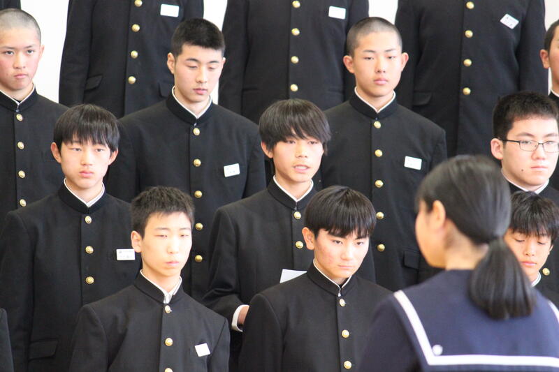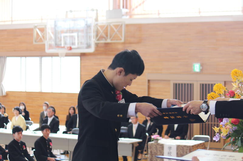 二つ目です。「人との出会いを大切にし、社会や人のために貢献できる人間に成長してください」。皆さんはこれまでの十五年の人生で多くの人々と出会い、様々な影響を受けて成長してきました。これからの皆さんには、新たな多くの出会いが待っています。人との出会いを大切にし、互いを尊重し思いやる気持ちを持ち続けてください。自分を支えてくれている方々への感謝の気持ちを忘れず、社会や人のために貢献できる人間に成長してくれることを願い、卒業生へのお祝いと激励の言葉とします。」