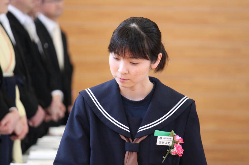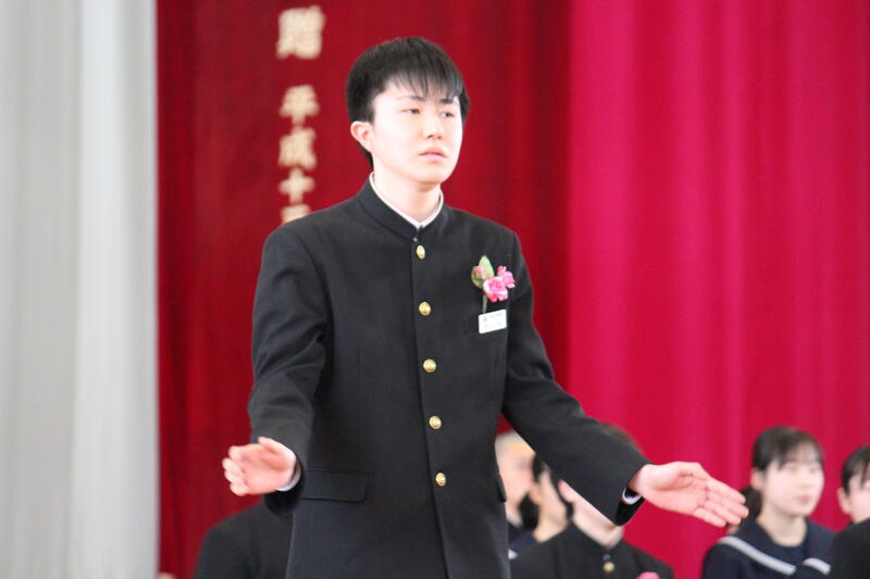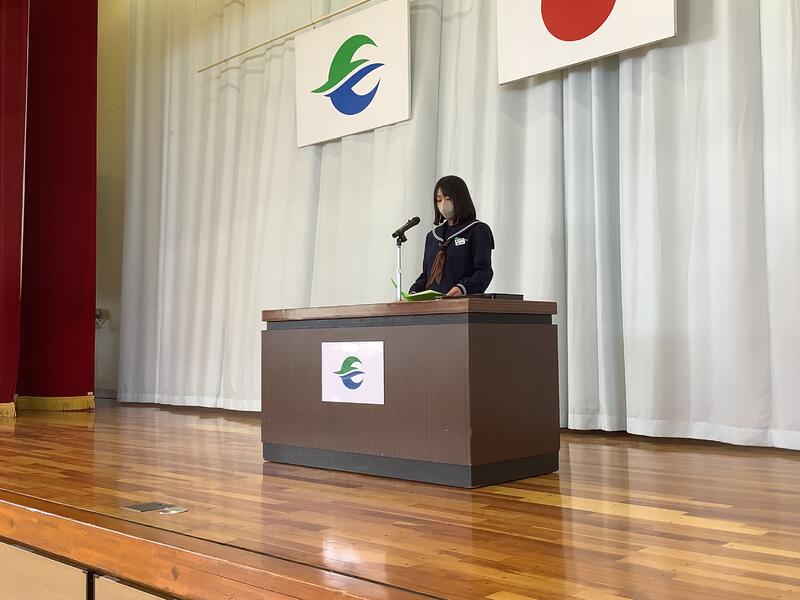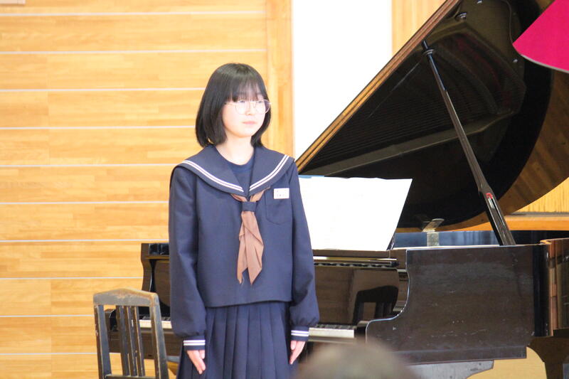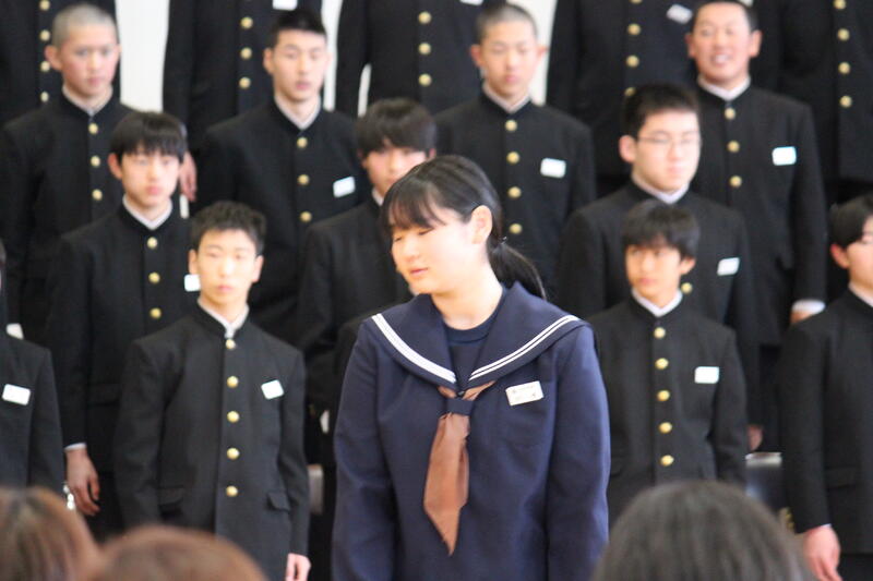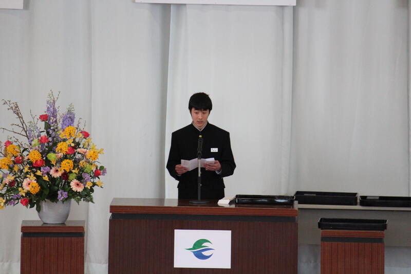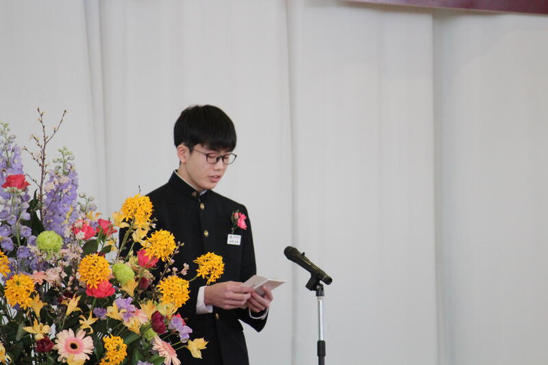 答辞は前生徒会長の柴原さんが述べました。3年間への感謝を、環境、教師、友人、家族に向けて言葉をかみしめながら、丁寧に述べていました。