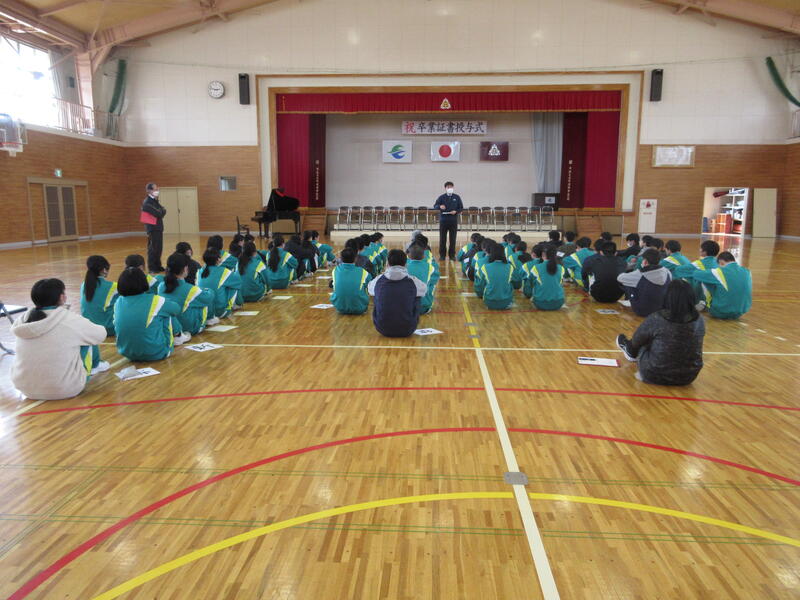 「人生の中では、輝いていたとき、輝いていなかったときがあります。目的を見失って、消防士の仕事を辞めようと考えたこともあります。人生の輝きとは、挑戦です。挑戦をしているとき人は輝いています。中学生のみんなは、ダイヤの原石です。磨かないと輝きません。磨くこと=挑戦です。これからのみなさんの人生が輝くことを期待しています。」中学生に話していただきましたが、我々教職員も学ぶことがたくさんありました。