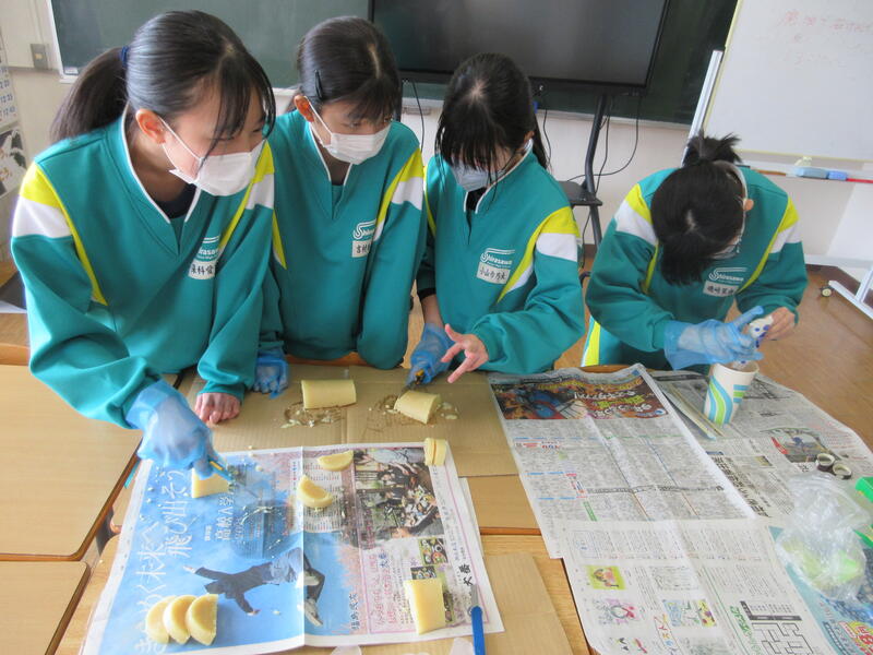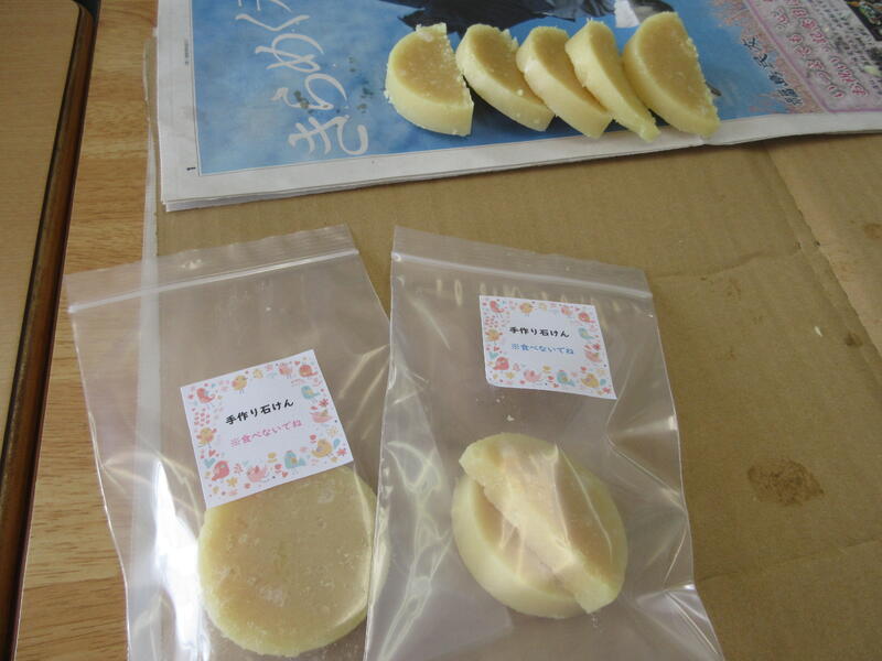 昼休み、給食委員担当の深谷さんか呼びかけて、使わなかった油で石けんをつくる活動をしました。以前作成したものを切ることと、新たな石けんをつくる作業を同時に行いました。切った石けんは、保健委員会に贈呈しました。清掃などで使えるといいと考えています。SDGsの意識をもって生活することが大切ですね。