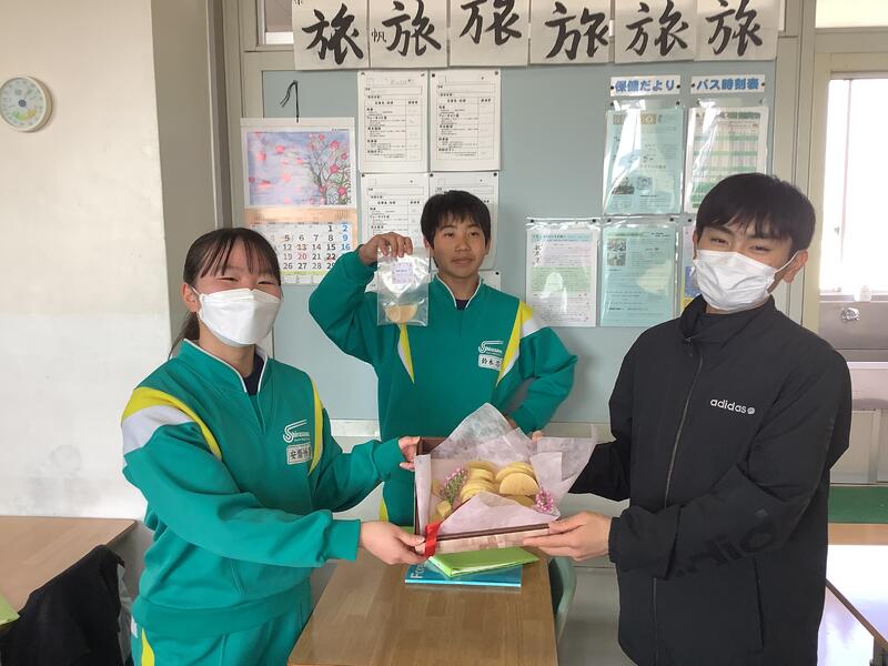 また一年生の教科担当係は、各担当教師に学級でまとめたメッセージカードを手渡していました。その気持ちが有難いですね。