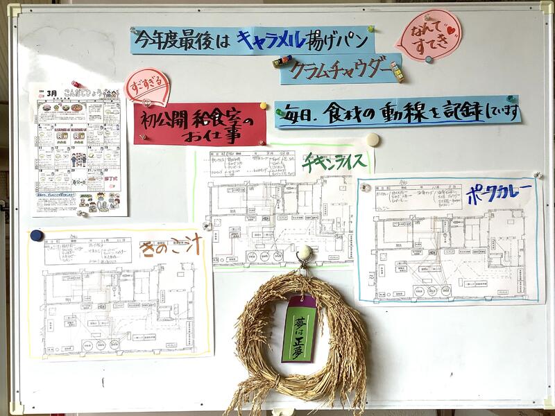 そして、最後といえば給食です。毎日調理員さんの笑顔と共に給食が当たり前のように時間どおりに準備されています。有難いですね。その中で、深谷さんと調理員さん達が毎日欠かさずやっている一部分を紹介します。