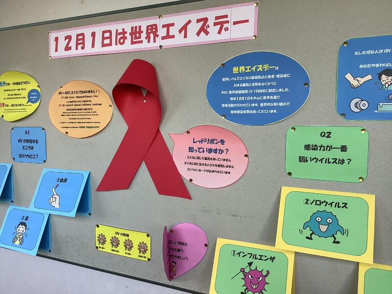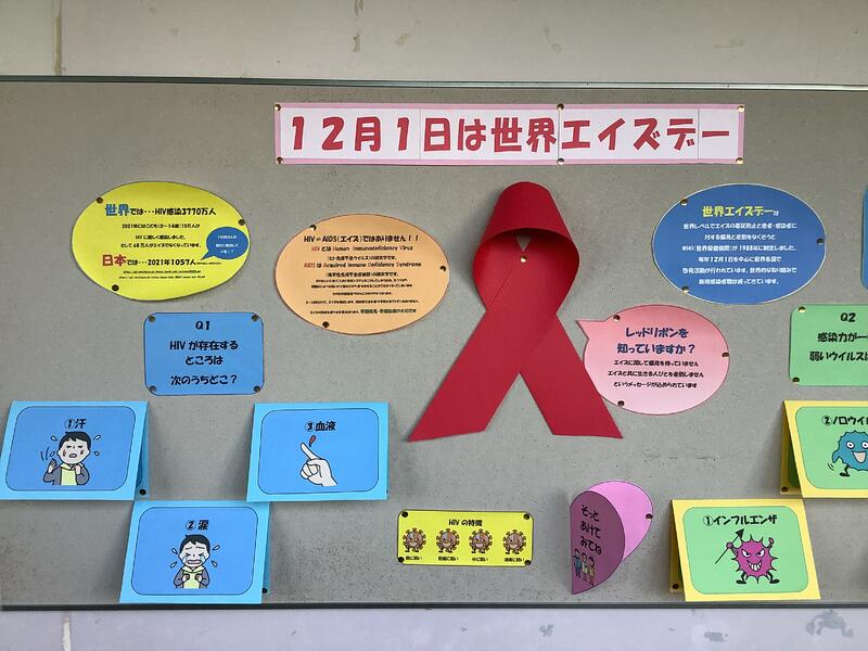 本日、12月1日は、世界エイズデーです。これは、「エイズの蔓延防止」と「正しい理解促進」を目的として、1988年に制定したようです。保健室の掲示板に養護教諭の矢吹先生が掲示しました。そこまで頻繁に話題になるわけではありませんが、日本でも年間1000人以上が毎年感染しています。今現在、治療法がないのが現状ですので、正しい理解、しっかりとした知識を持つ必要がありますね。