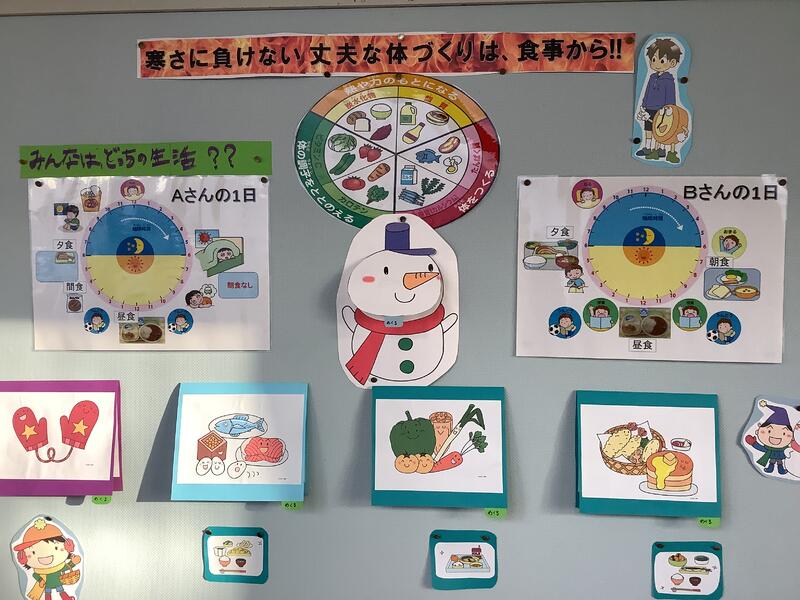 給食室前は、食事について。寒さに負けない食事についての話題です。エネルギーを摂取できるのは、食事のみです。適度な運動、食事、休養(睡眠)どれも大切です。中学生ですので、意識して生活させたいものです。