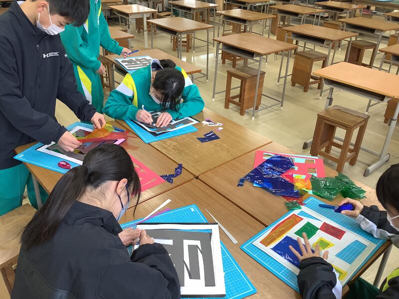 昼の美術室では、生徒会本部役員が、掲示物を作成していました。きれいな紙を貼り合わせて、楽しそうに活動しています。完成するのがいつかはわかりませんが、楽しみに待ちたいと思います。