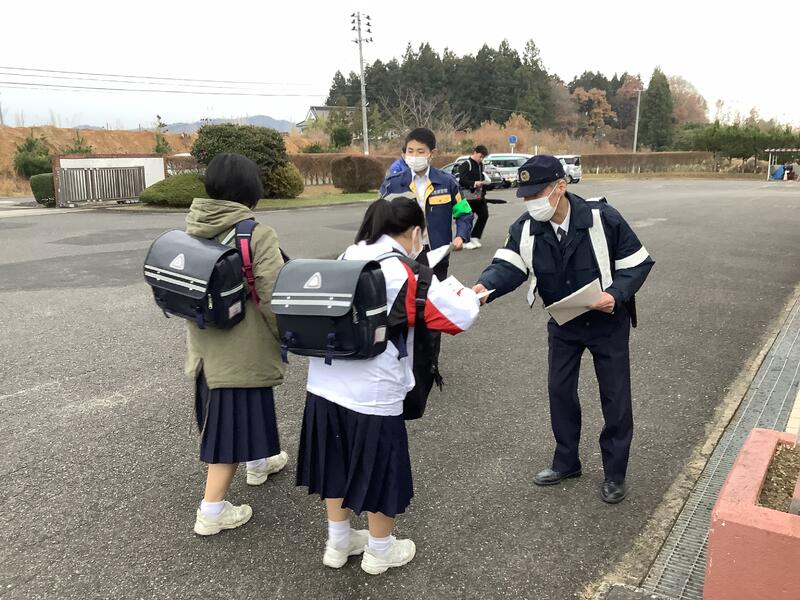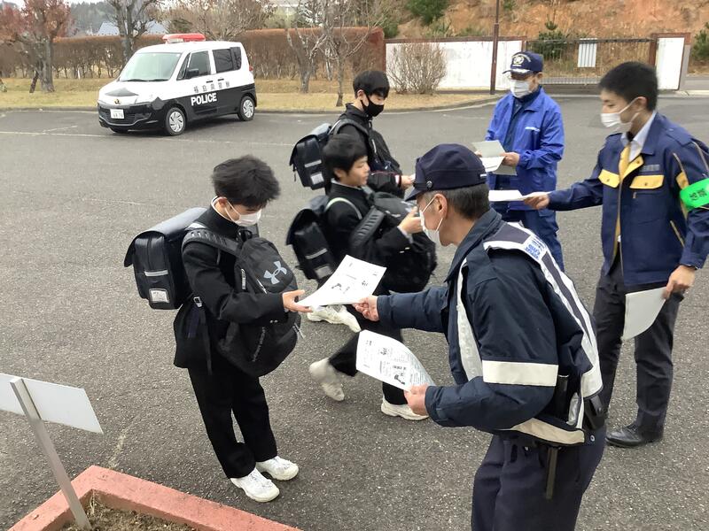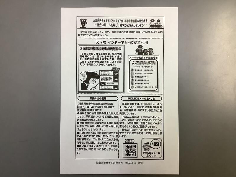 本日、早朝より郡山北警察署本宮分庁舎、生活安全課の署員が来校し、中学生に対しプリントを配付しました。SNSや深夜外出についてなど、年末・年始にむけて注意喚起する内容です。我々大人が安心安全のため、そして健全育成のためにできることはやらなくてはいけません。被害に遭ってからでは遅いという感覚はもっておく必要はあります。