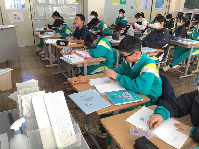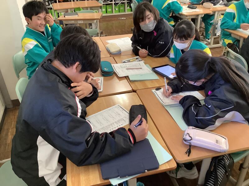 今日は、2-1組の数学の授業より。数学では、「証明」をしています。根拠をもとにして、説明していくという分野です。物事を決めていく上で、根拠をもとにして理詰めをしていくことはこれから養っていかなくてはいけない力です。数学的な表現を使って、記述していく活動をグループで行いました。グループで考え合う活動を通して、理解度を高めていました。
