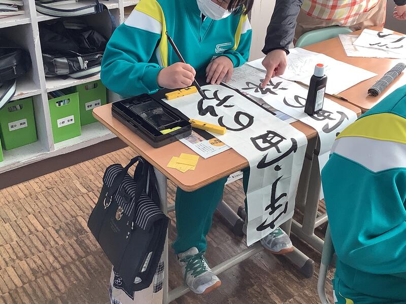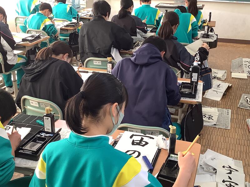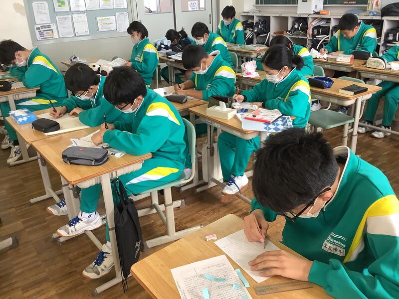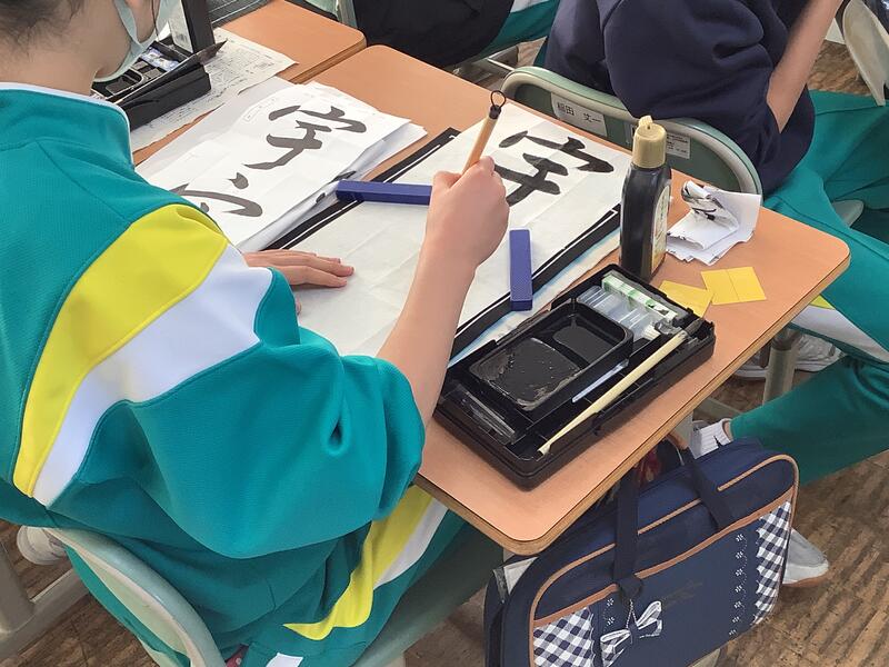 2年生では、習字の授業を行っていました。教室に入ると、落ち着いた雰囲気で、紙のこすれる音と筆を置く音のみが響いていました。教室に入るのも写真を撮るのも非常に気を遣いました。集中力がある、さすが2年生です。行書の字も力強い生徒が多かったですね。普段は、ざわざわしていることが多いので、メリハリがきいていて心地のよい空間になっていました。