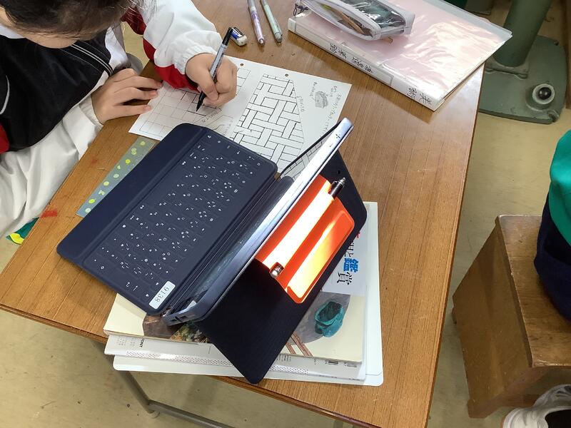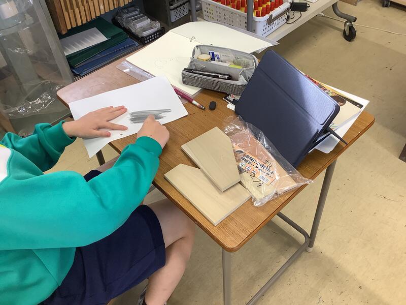 1年生の美術では、木製のテープカッターのデザインを作成していました。タブレットを利用して、イメージを膨らませ、下書きを描いていました。デザインをしたものを彫刻刀で彫っていくので、あまりにもデザインが細かいと難しいので慎重に考えていました。丁寧に作成すると愛着がでて、大切に利用する作品になります。どんな作品になるのか楽しみです。