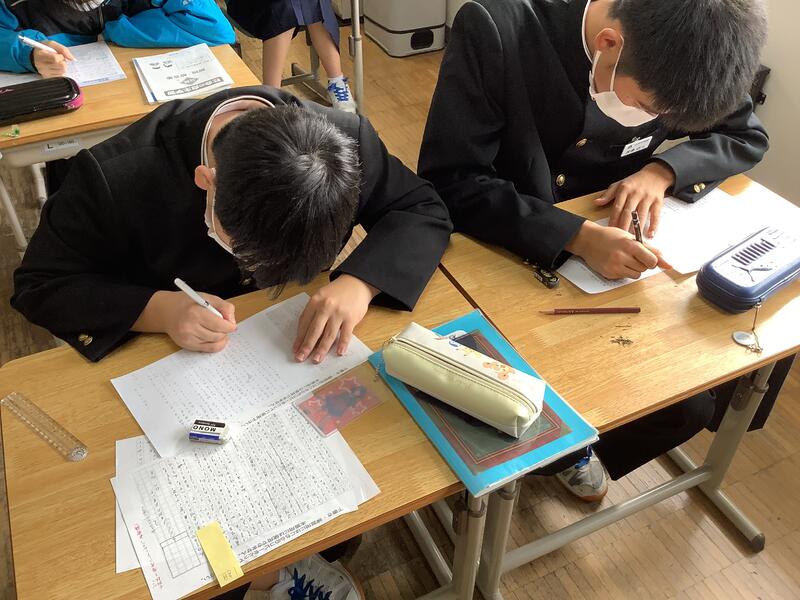 3年生は、面接練習がスタートしています。私立高校の推薦試験を受ける生徒は年内に仕上げる必要があります。自己PR、志願理由など、自分のことばでしっかりと伝えなくてはいけません。悩みながらも一生懸命に考えをまとめていました。