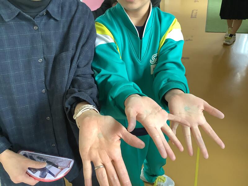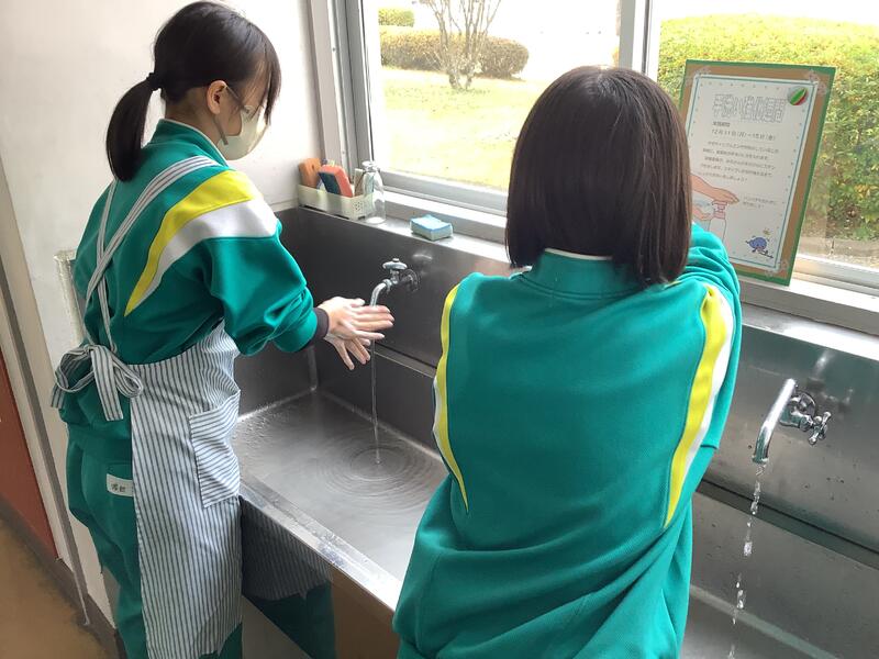 さて、「手洗い強化週間」の様子です。保健委員会が、生徒全員の手に専用スタンプを押しました。それが落ちるように石けんで手を洗ってから給食の準備です。ハンカチチェックも行います。手のばい菌をしっかりと落とす意識で手を洗う週間がつくことがねらいです。教職員もいつもよりも入念に洗いました。これが毎回できるようにしたいです。