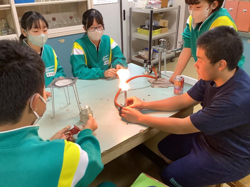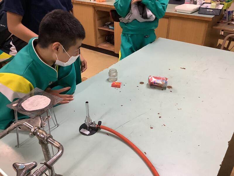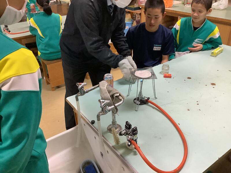 2年生の理科では、気圧の実験を行っていました。ガスバーナーで水を入れた缶を加熱し、ラップで蓋をして冷ますと缶がどのような変化が起こるかを観察していました。スムーズに火を付けて手際よく実験を行っていました。実験は、楽しいですね。