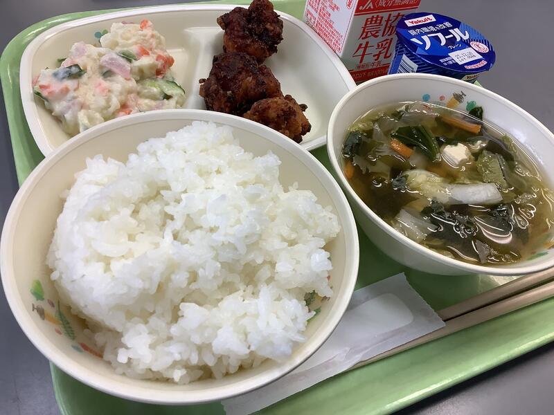最後に、今日の給食は家庭科の授業で1年生の渡邊さんが考えた献立でした。期待通りの間違いない抜群の美味しさでした。旬の白菜が入ったさわやかなわかめスープ、適度な大きさのジャガイモが入ったポテトサラダ、そして抜群の美味しさの唐揚げです。ちなみに唐揚げの味付けは、塩麹とショウガのみだそうです。驚きです。
