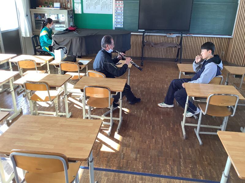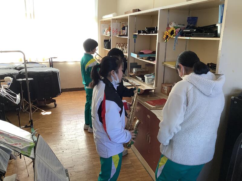 昼休み、まだまだ体育員会の運動企画が続いています。そして、昨年同様に、今年も特設吹奏楽部を組織して、昼に練習を行っています。顧問の遠藤先生が見本を見せたり2年生が1年生に教えたりして、とてもよい雰囲気で練習をしています。