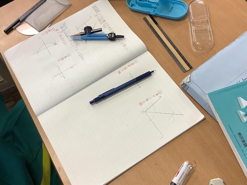 1年生の数学の授業より。今日は作図のテスト、問題練習を行っていました。作図は、ただの作業になってしまいがちです。髙橋先生は、なぜコンパスを使わなくてはいけないのか、なぜ垂線が引けるのか、等しい線分が引けるとどんなことがいえるのか、など丁寧に考えさせていました。生徒達の反応もよく、楽しく学習できていました。