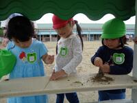 砂場にも新しい砂が入り、さくら組の子どもたちが砂の山を崩してたいらにしてくれました。