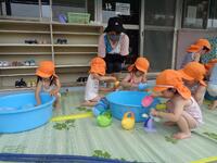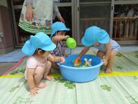すみれ組さん(1歳児)は、初めて保育所で水遊びをするお友達が多くいました。