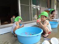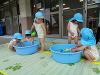 たんぽぽ組さん(2歳児)は、数名ずつ分かれて広々とした空間で水遊びをしました。