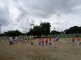 おひさまがにこにこと見守る中、0歳児から3歳児67名全員で元気いっぱい体を動かしました。