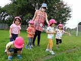 さくら組さん(3歳児)は、広い原っぱで虫探しに夢中です。ばったやかまきり、せみの抜け殻を見つけ、大事そうに友だちに見せています。