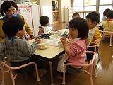 すみれぐみさんは先生と一緒においしい給食を食べています。手づかみやスプーンで自分で食べようと 頑張っています。