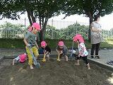 砂を取り除いていただいた砂場にも新しい砂が入り、3歳児さくら組さんも大喜びです。スコップを使って一生懸命砂の山を崩しています。感染症対策をしながら、砂や水の感触を十分楽しめるように夏の遊びを進めていきたいと思います。